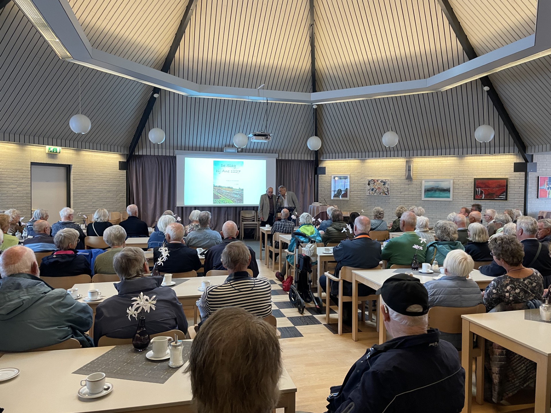 We sloten de dag af in Ontmoetingscentrum De Hoeksteen, vlakbij het kasteel. De heer Wim Visscher gaf een lezing over de slag bij Ane en de vermoedelijke plek van het Cisterciënzer klooster dat in Holthone zou hebben gestaan, voor het werd verplaatst naar Assen. En dat alles onder het genot van een kop koffie.